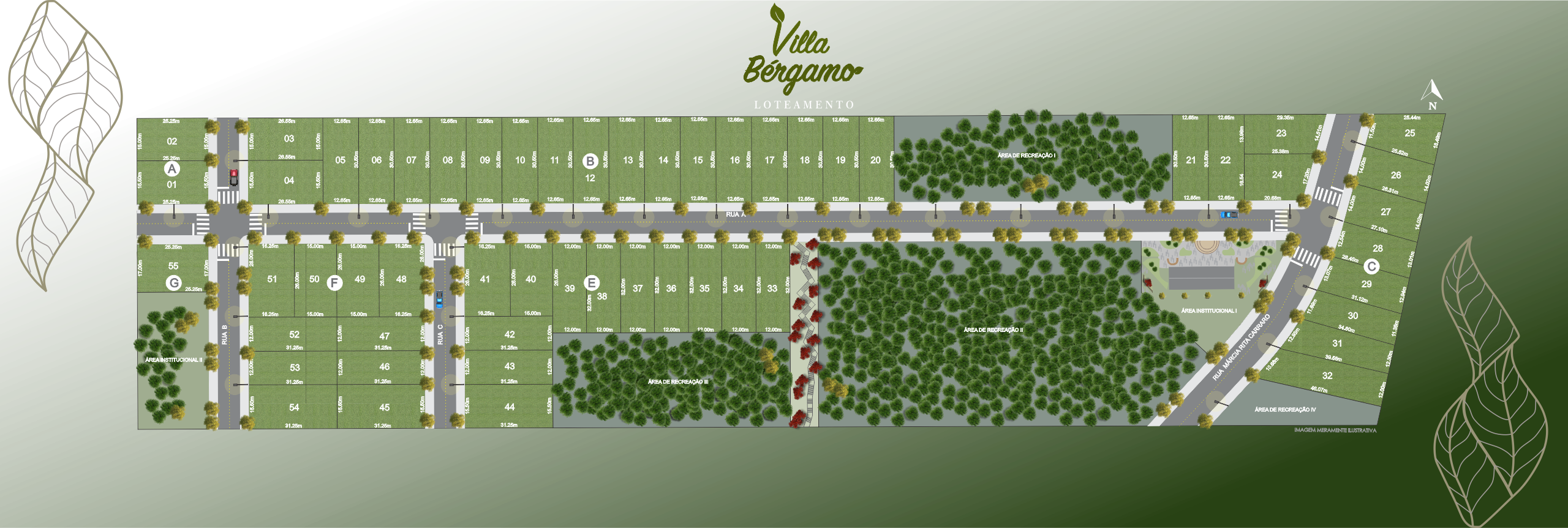 Possui lotes residenciais de 378,57m² a 512,38m².